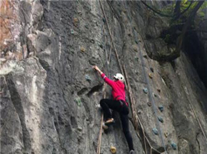 學(xué)員在培訓(xùn)師的指導(dǎo)下,在只允許抓、握、蹬、踩巖石點(diǎn)的情況下 ,全力向巖石壁最高處攀爬。