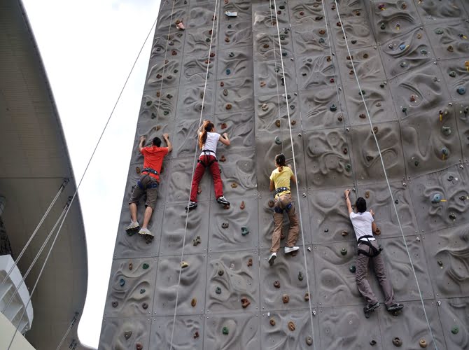 1. 攀巖時,身體盡量貼近巖壁,控制好身體平衡; 2. 盡量使用腿部力量攀登,注意觀察腳下支點(diǎn)。 3. 三點(diǎn)固定一點(diǎn)移動。 4. 學(xué)員在中途休息時可向后甩手,使雙手得到充分休息; 5. 提醒學(xué)員合理分配體力; 6. 鼓勵學(xué)員堅定意志,勇往直前,爭取所有隊(duì)員都攀到最高目標(biāo)。 |