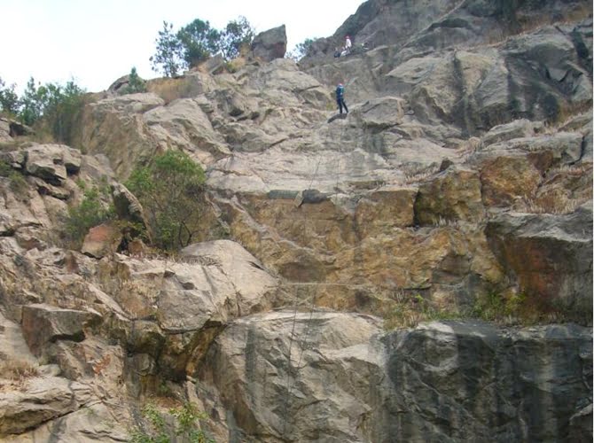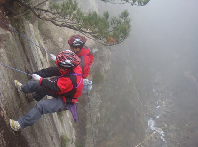 項目布置: 培訓師帶領學員走一段山路到達崖底,講解并示范頭盔、安全帶、八字環、靜力繩的使用和下降時的動作要領,宣講安全注意事項,詢問身體狀況,培訓師應先行到崖頂為學員做一次下降示范,下降過程中示范怎么操作制動端的繩,雙腳打開腳面撐穩崖壁等,由培訓師帶領一部分學員到達崖頂進行項目操作,因為眾基均采用雙保護的方式來保護學員安全,所以整個項目操作過程需兩名以上培訓師進行項目監控和保護工作。 |