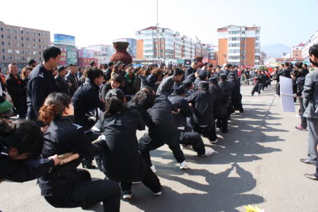 規(guī)則:比賽采用淘汰制,一局定輸贏。每隊(duì)人數(shù)24人,分成3組,每組拉住一條拔河繩,每繩8人,4男4女!
