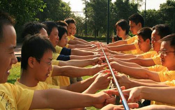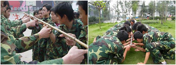 4、要求小組成員將齊眉棍保持水平,小組的任務是:在保證每個人的手都在齊眉棍下面的情況下,將齊眉棍完全水平的往下移動。一旦有人的手離開齊眉棍或齊眉棍沒有水平往下移動,任務就算失敗;