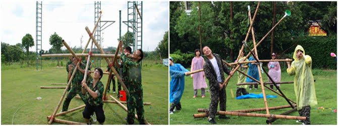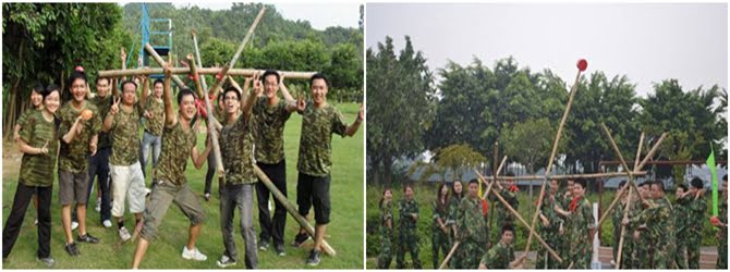隊員利用一些指定的器材扎成一個羅馬炮架,所有隊員必須進入指定的活動區域,利用扎好的羅馬炮架,發送水彈攻擊對方對員。分組團隊先通過一系列的考驗(考驗由3-5個拓展項目組成),獲得資源(竹子九長一短,九根長繩。一把大勺,若干個氣球水彈),然后在一個固定的戰場利用資源架起一尊古羅馬炮架來攻擊別的團隊,得分多者為勝。