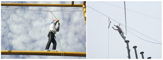 學員依次攀上約8米高的圓木,從圓木一端走到圓木另一端。一條懸空而又狹窄的道路,雖然平坦,然而想要突破,就要拿出你全部的勇氣。